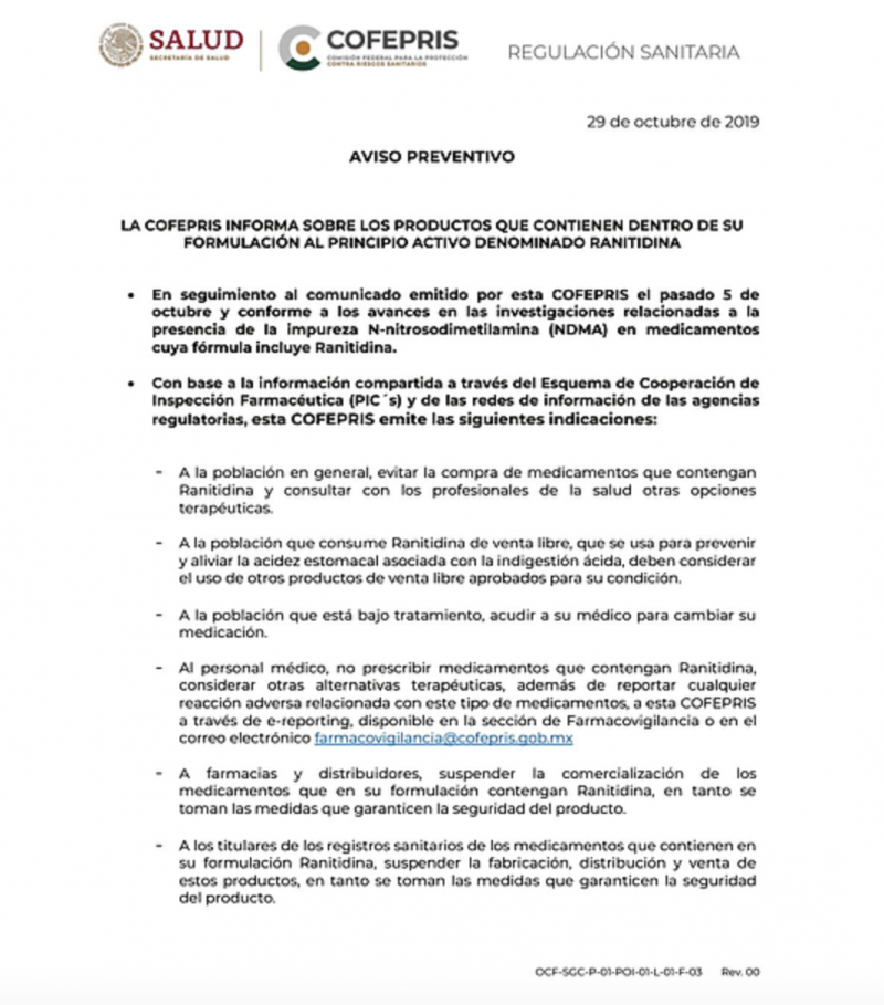 Desde el pasado 5 de octubre, la Comisión Federal para la Protección contra Riesgos Sanitarios informó que se encontraba evaluando los riesgos sanitarios por consumir medicamentos con ranitidina, pero no se encontró la evidencia suficiente para emitir una indicación por riesgo de consumo.