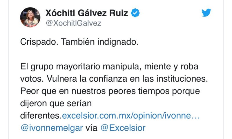En su cuenta de Twitter, la legisladora afirmó que el grupo mayoritario "manipula y miente". Las palabras de Gálvez derivan de la polémica en el Senado por la votación para elegir a la nueva presidenta de la Comisión Nacional de los Derechos Humanos (CNDH), que será Rosario Piedra Ibarra, en la que los panistas acusaron fraude.
