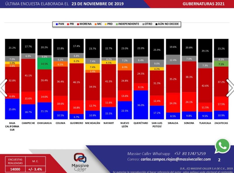 Los estados encuestados fueron Baja California Sur, Campeche, Chihuahua, Colima, Guerrero, Michoacán, Nayarit, Nuevo León, Querétaro, San Luis Potosí, Sinaloa, Sonora, Tlaxcala y Zacatecasdonde lideran en la preferencia de la ciudadanía los candidatos de Morena.
