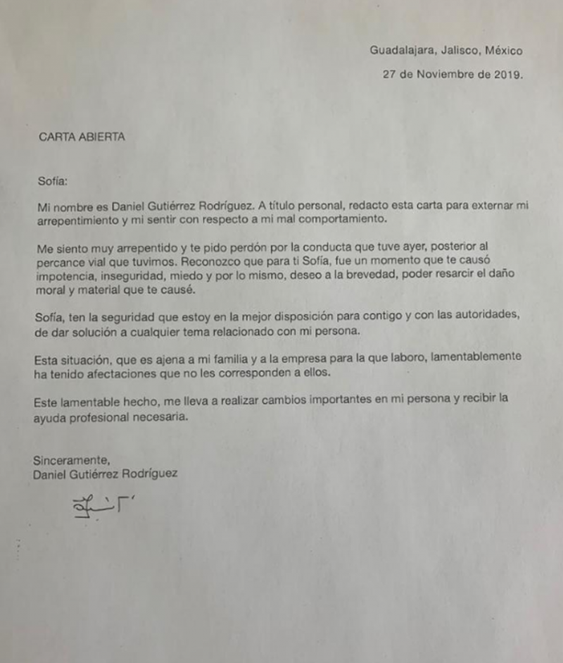 Daniel Gutiérrez Rodríguez ahora conocido como #LordCafé, pidió perdón a través de una carta a Sofia, la mujer que agredió este martes por la mañana tras un percance vial en Guadalajara.