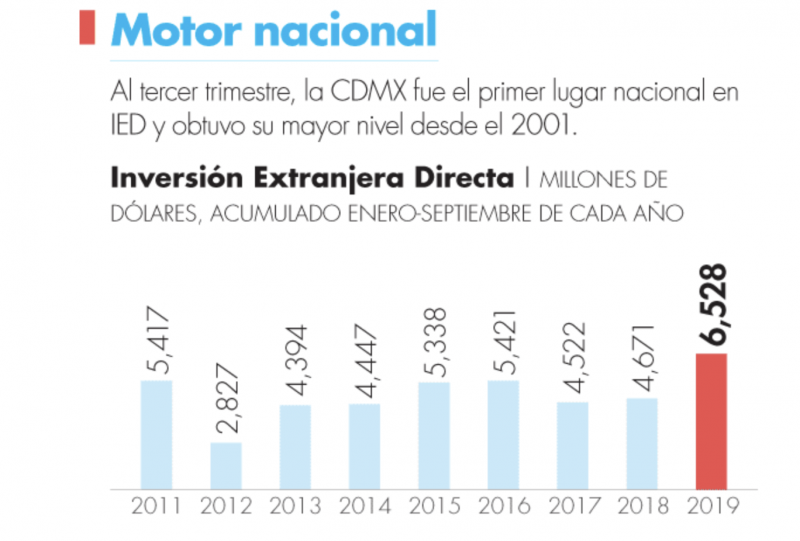De acuerdo con datos de la Secretaría de Economía federal, en los primeros nueve meses del 2019 la Ciudad de México captó 6,528 millones de dólares de IED —primer lugar nacional—, el mejor nivel para un mismo periodo de comparación desde el 2001 (9,640 millones).