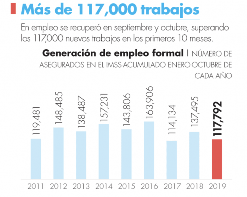 Por lo anterior, se recuperó la generación del empleo, añadió. Según datos del IMSS, en el mes de octubre se crearon 32,396 trabajos formales, llegando a un acumulado de 117,792 plazas en los 10 primeros meses del año, colocándose en primera posición en el país.