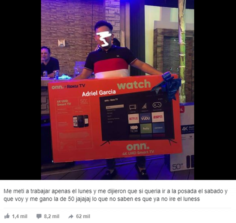 En redes se viralizó un post de un joven llamado Adriel García, quien relató que el día de la posada de su trabajo ganó una pantalla de 50 pulgadas, lo gracioso de la situación es que apenas llevaba 5 días trabajando en la empresa y tomó la decisión de ya no presentarse más.