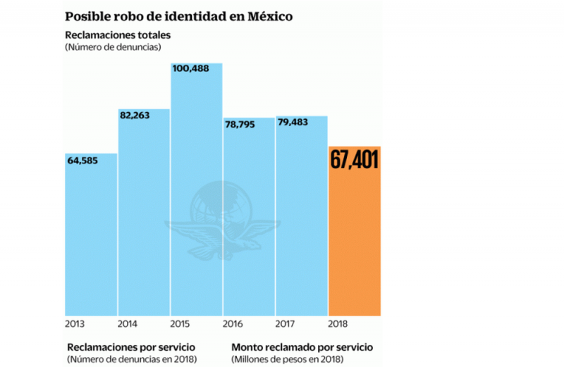 El documento avalado por el director adjunto de la Dirección General del Registro Nacional de Población e Identidad, Armando Robinson Álamo, con fecha del 23 de octubre de 2019, refiere que la Comision Nacional de Protección y Defensa de los Usuarios de Servicios Financieros (Condusef) reportó 67 mil 401 reclamaciones por posible robo de identidad en 2018.