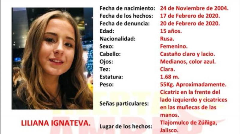 La Fiscalía informó que se trata de Liliana Ignateva, de 15 años, de nacionalidad rusa, quien fue vista por última vez el 17 de febrero, en Tlajomulco. La menor tiene una cicatriz en la frente y en las muñecas de las manos, como señas particulares.