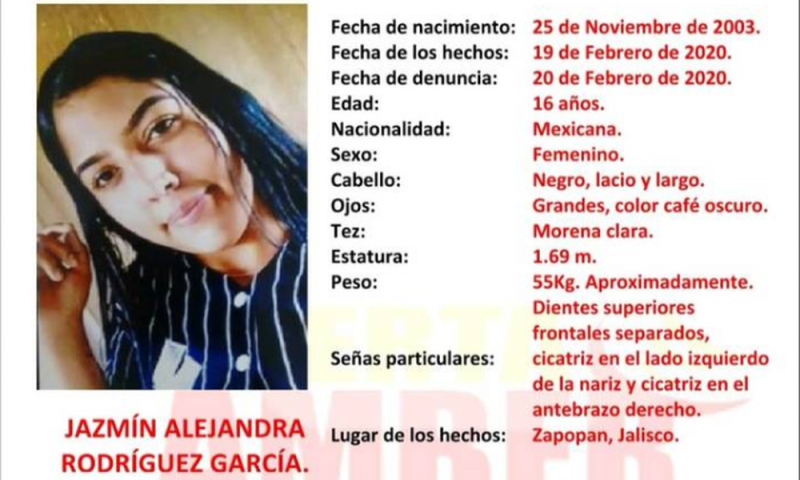 Finalmente Jazmín Alejandra Rodríguez García, 16 años, quien fue vista por última ocasión el 19 de febrero, en Zapopan. Ella cuenta con una cicatriz la nariz y en el antebrazo derecho, además de los dientes superiores separados.