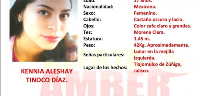 El segundo caso corresponde a Kenia Aleshay Tinoco Díaz, de 17 años, desaparecida desde el 18 de febrero, también en Tlajomulco. Ella cuenta con un lunar en la mejilla izquierda.