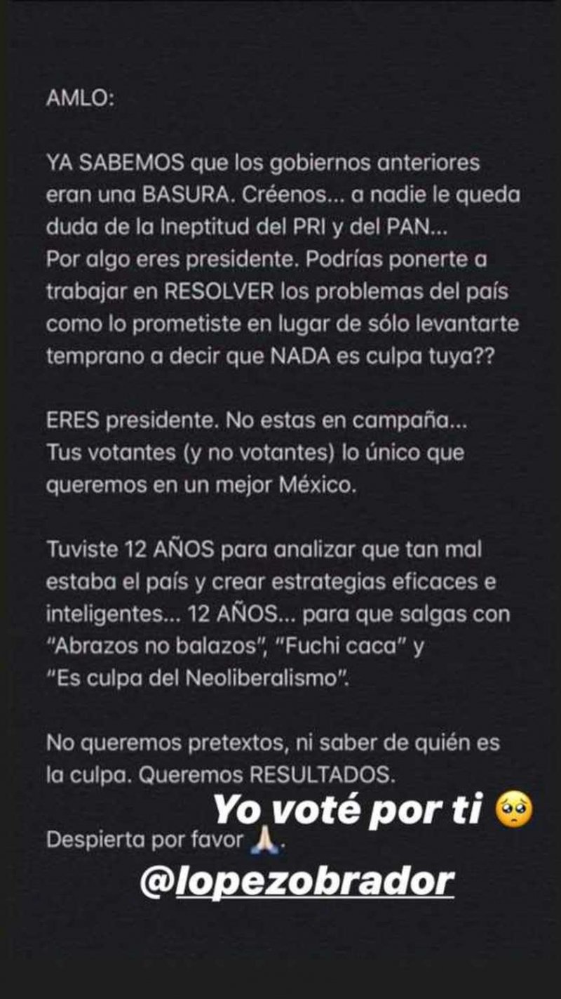 "AMLO: Ya sabemos que los gobiernos anteriores eran una basura. A nadie le queda duda de la ineptitud del PRI y el PAN. Por algo eres presidente. ¿Podrías ponerte a trabajar en resolver los problemas del país en lugar de sólo levantarte temprano a decir que nada es culpa tuya?”, escribió en la carta Lizbeth Rodríguez.