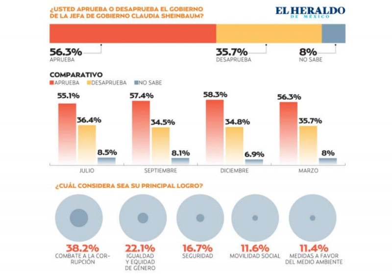 Para los ciudadanos, el principal logro de la titular del Ejecutivo capitalino es el combate a la corrupción (38.2 por ciento), seguido de medidas a favor de la Igualdad y Equidad de Género (22.1 por ciento).