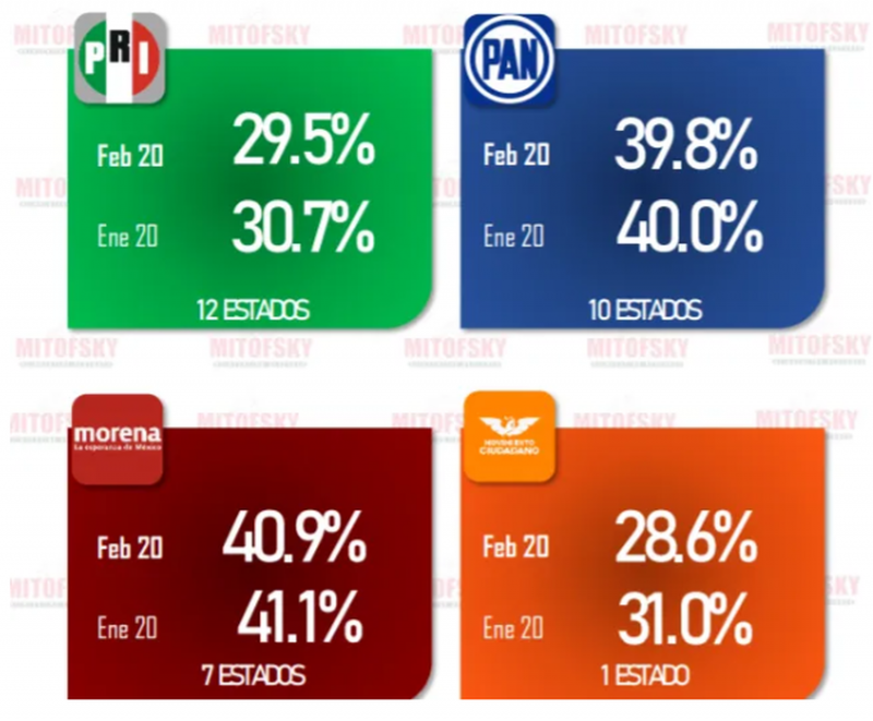 Dicho trabajo de investigación arroja números positivos para el partido Movimiento Regeneración Nacional (Morena), pues es la fuerza política con mayor aprobación en México con una aceptación del 40.9%. Los titulares del ejecutivo estatal con mayor aprobación dentro de Morena son: Claudia Sheinbaum y Rutilio Escandón, quienes se encuentran dentro de los cinco mejores gobernantes de todo México, así como Jaime Bonilla, gobernador de Baja California.