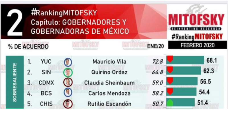 Además, el estudio indica que de cinco ejecutivos estatales que se encuentran en primer lugar, cuatro registraron en febrero una disminución respecto a enero; sólo dos mandatarios se mantuvieron superiores a 60%. De este modo, Mauricio Vila, gobernador de Yucatán disminuyó 4.7 puntos porcentuales, quedando así con un 68.1% de aprobación; por su parte, Quirino Ordaz, de Sinaloa, alcanzó 62.3%, 2 puntos y medio menos que al iniciar el año; mientras que Claudia Sheinbaum, mandataria de la Ciudad de México, bajó de 59% a 56.5%; seguida del mandatario de Baja California Sur, Carlos Mendoza, quien disminuyó 3.8 puntos porcentuales, pasando de 58.2% a 54.4%.