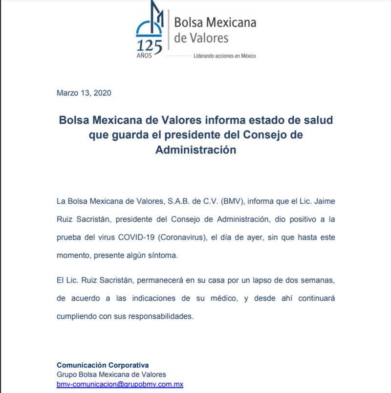 Permanecerá en su casa por un lapso de dos semanas, de acuerdo a las indicaciones de su médico. Jaime Ruiz Sacristán, presidente de la Bolsa Mexicana de Valores (BMV), está contagiado de coronavirus, confirmó este viernes el Grupo Bolsa Mexicana de Valores.