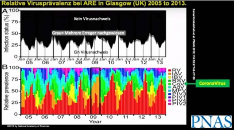 Como ha demostrado Wodarg en su web y en varios vídeos y entrevistas, desde 2005 a 2013 comprobaron en un estudio en Glasgow qué virus ocurren entre las enfermedades respiratorias. En este estudio se muestra claramente que las partes verdes que son el coronavirus siempre han formado parte de la mezcla. Aquí lo podemos comprobar en las zonas verdes.