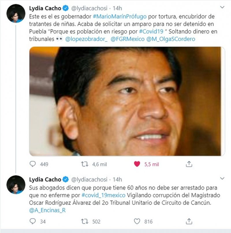 Por medio de su cuenta de Twitter, la comunicadora emitió una serie de mensajes en los que informó que Marín Torres, solicitó un amparo para no ser capturado por el delito de tortura que pesa en su contra