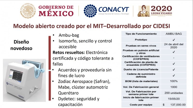 “es un modelo abierto creado por el MIT, pero desarrollado con una serie de retos que se tuvieron que enfrentar puesto que los principios de diseño que liberó el MIT son muy genéricos y no son suficientes como para llegar a tener realmente un prototipo ya funcional. El Centro de Ingeniería y Desarrollo Industrial (Cidesi) es uno de los centros públicos de investigación del Conacyt y en colaboración con algunos otros centros, pero teniendo la coordinación ahí en el Cidesi, es con quien hemos estado trabajando la coordinación de este desarrollo. Se logró ya este prototipo que ya está justo mañana, en colaboración con el doctor Alejandro Alagón, de la UNAM, y un cirujano de animales, veterinario muy bueno, la última prueba que vamos a hacer, que es una prueba en seres vivos, dado que es un modelo todavía de restringido uso médico, como les decía, hay dos, al menos, ya equipos comerciales que se están distribuyendo en España con estos principios de diseño y de ingeniería que están dando muy buenos resultados. Se han hecho pruebas en pulmón artificial y otros mecanismos de prueba para estar seguros que cumple con los requerimientos y lograr la certificación de Cofepris. Ya está sometido todo el expediente y esperamos esta aprobación en las próximas horas, después de haber sometido las pruebas biológicas también, la certificación también de la planta de ensamblaje de Cofepris, en este caso encontramos una alianza realmente muy positiva con una empresa, parte del Grupo Safran, que son empresas aeroespaciales francesas que de manera muy generosa han ofrecido, ya están, empezando las líneas de ensamblaje con base en todos los planes de ingeniería proporcionados por el Cidesi-Conacyt, nada más esperando a tener las últimas pruebas y certificación por parte de Cofepris”.