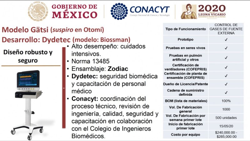“El que sigue muestra el segundo equipo que hemos estado acompañando, revisando toda la base de ingeniería de esta propuesta, es un modelo mexicano Gätsi, quiere decir suspiro en otomí, es un desarrollo de Dydetec, que es una empresa que…. de una empresa con una larga trayectoria en la construcción y la instalación de equipos médicos, Biossman, tiene alto desempeño para ser usado este equipo en cuidados intensivos, se apega a esa norma que está ahí. El ensamblaje también se hará en colaboración sin fines de lucro con esta empresa Zodiac, y la propia empresa Dydetec le dará seguimiento a la seguridad biomédica”.