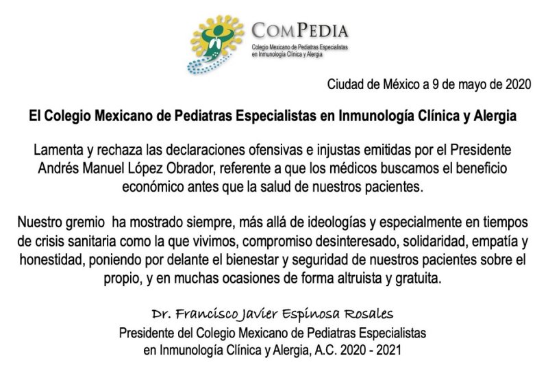 El Colegio Mexicano de Pediatras Especialistas en Inmunología Clínica y Alergia lamentó y rechazó las declaraciones del presidente López Obrador, mismas que consideró “ofensivas e injustas”.