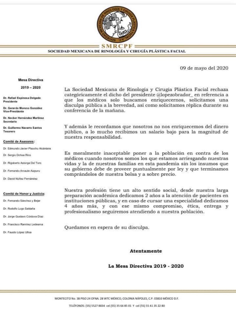 La Sociedad Mexicana de Rinología y Cirugía Plástica Facial solicitó su derecho de réplica, al tiempo que aseguró al presidente que “no nos enriquecemos del dinero público, a lo mucho recibimos un salario bajo para la magnitud de nuestra responsabilidad”.