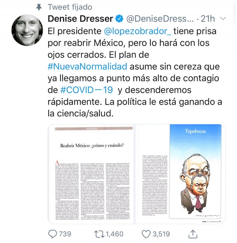 La politóloga y escritora Denise Dresser volvió arremeter contra el presidente López Obrador, esta vez por las medidas que AMLO está tomando para reactivar la economía y regresar poco a poco a la “nueva normalidad”.