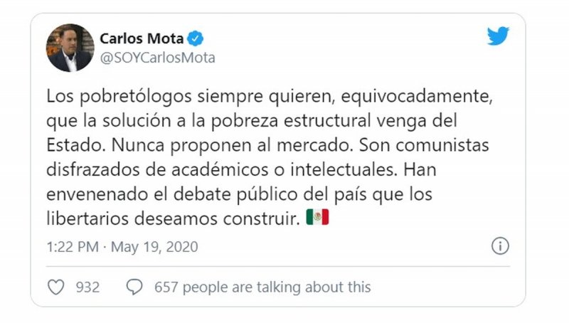 Asimismo, Mota señaló que las acciones del partido del presidente (morena) para erradicar la pobreza son «ocurrencias comunistas», pues es para tontos creer que hay que combatirla.