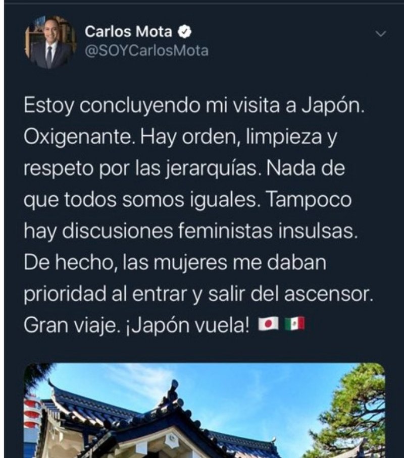 En octubre pasado cientos de críticas le llovieron a Carlos Mota luego de señalar que en su viaje a Japón valoró que en el país nipón no exista la igualdad de genero ya que las mujeres respetaban su jerarquía como hombre.
