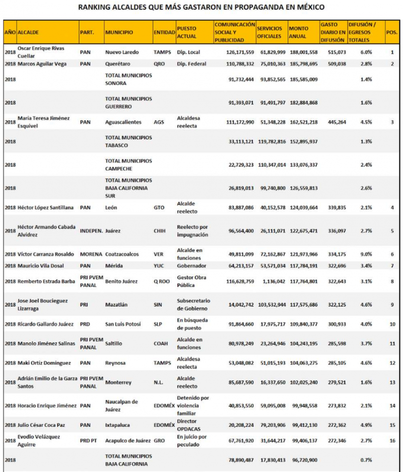 Oscar Enrique Ricas Cuellar, alcalde de Nuevo Laredo, Tamps. y Marcos Aguilar Vega, de Querétaro, Qro. fueron quienes más aprovecharon el erario para promoverse, ocupando más de medio millón de pesos para cada uno de los 365 días de 2018, es decir, más de 20 mil pesos cada hora.