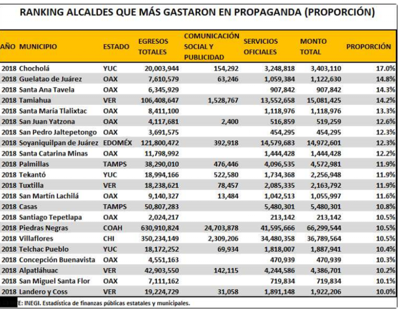 Destacan 22 que erogaron entre el 10 y el 17% de su presupuesto total para publicitarse, pese a que la gran mayoría “gobierna” en ayuntamientos verdaderamente marginados.