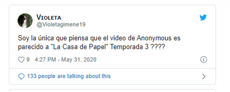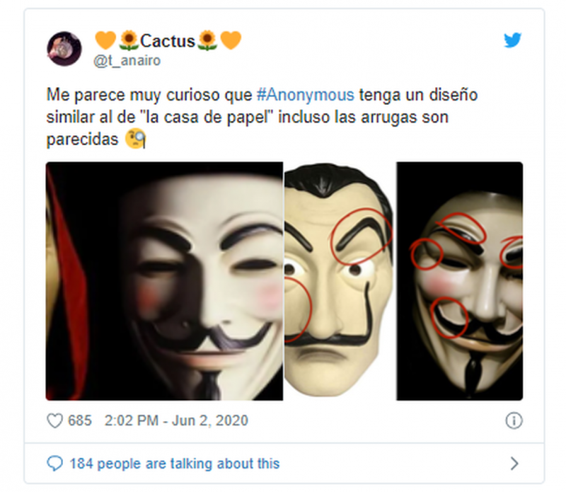 La máscara de #Anonymous no está inspirada ni en "La casa de papel" ni en "Mr.robot" está inspirada o, mejor dicho, es la máscara de "V for Vendetta", también conocida como la máscara Guy Fawkes. pic.twitter.com/IlwsMAdF26