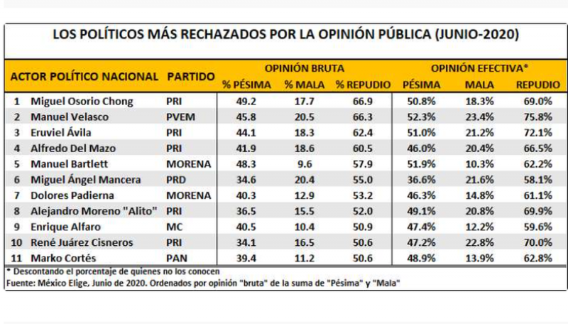 La entrega mensual de la encuesta México Elige, correspondiente al mes de junio, reveló que al menos 11 políticos nacionales cuentan con el rechazo de más de la mitad de los mexicanos, estando a la cabeza los senadores plurinominales Miguel Ángel Osorio Chong (PRI), Manuel Velasco (PVEM) y Eruviel Ávila (PRI).