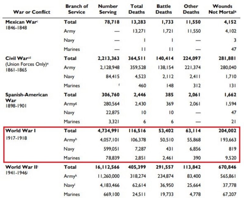 De acuerdo con el Servicio de Investigación del Congreso estadounidense, la Primera Guerra Mundial dejó 116 mil 516 muertos en el país, 53 mil 402 de ellos en batalla.