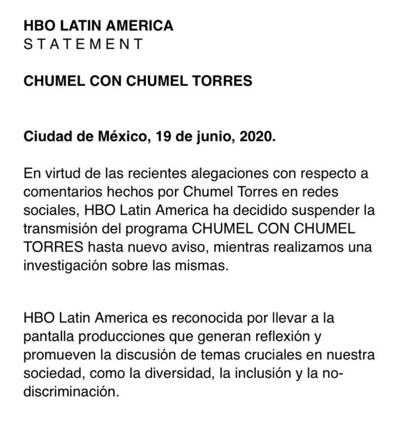 La cadena HBO Latin America dio a conocer la suspensión del programa Chumel Con Chumel Torres, luego de la polémica en la que se vio inmerso el comunicador tras la cancelación de su participación en un foro organizado por la Conapred.