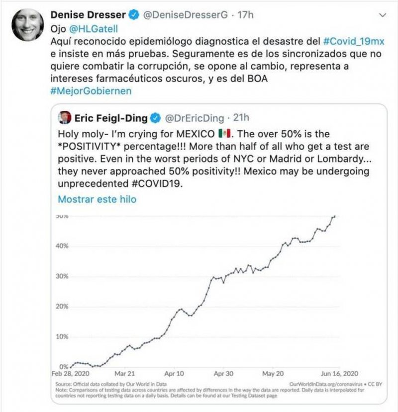 Y es que, en los tuits del “reconocido” epidemiólogo lamenta la situación en México con respecto a la pandemia. Pues señala que más de la mitad de las pruebas de Covid-19, resultan positivas.