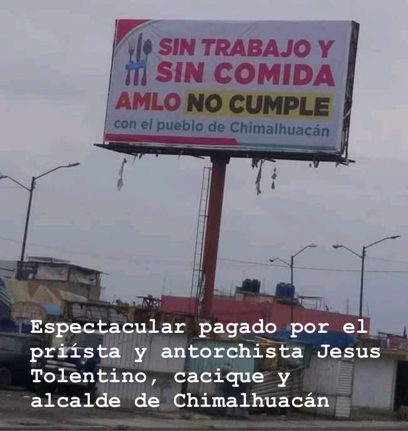 Que el priista y cacique antorchista Jesús Tolentino, presidente municipal de Chimalhuacán, y porro de profesión, se gaste el dinero público en espectaculares en vez de en apoyos sociales, no es culpa de López Obrador. pic.twitter.com/vq5LoyQXs1