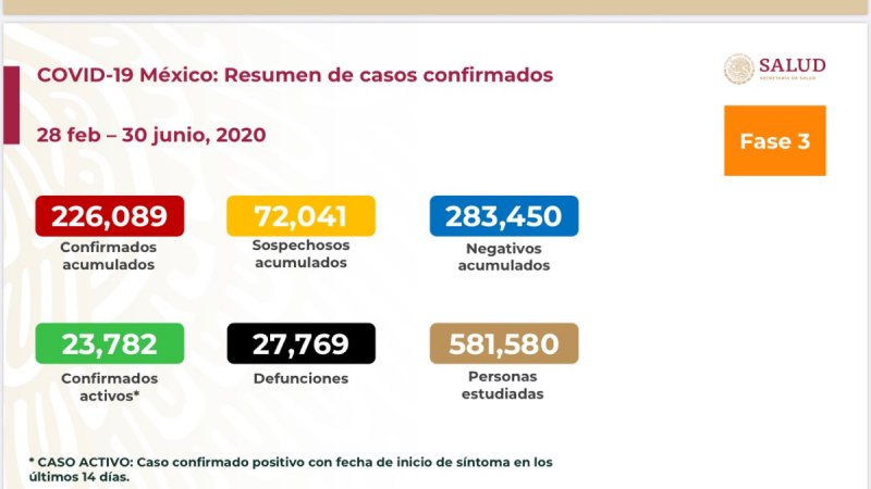 La Secretaría de Salud dio a conocer este martes que suman 226 mil 089 casos confirmados acumulados de COVID-19 en México, de los cuales 23 mil 782 son activos, mientras que hay 27 mil 769 muertos por la enfermedad.
