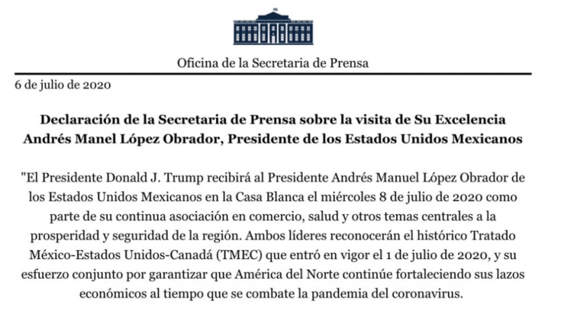 En el comunicado, se señala que Trump, recibirá al titular del Ejecutivo federal en la Casa Blanca el día de mañana miércoles 8 de julio, como parte de lo que se apunta, es parte de la continua asociación bilateral en temas como el comercio y la salud, entre otros.