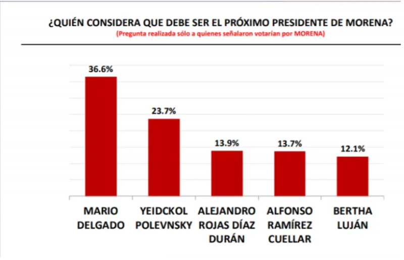 Asimismo el 34.1% de los encuestados señala que Mario Delgado es quien cuenta con mayor experiencia y capacidad para llevar a Morena al triunfo electoral en 2021.