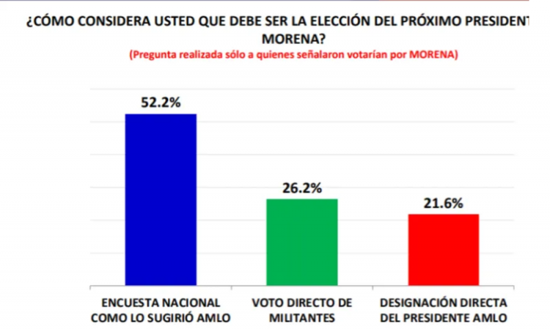 Muestra de ello, son los resultados obtenidos en la encuesta telefónica de Masive Caller donde 52 de cada 100 personas entrevistadas expresan estar a favor de que la dirigencia nacional de Morena se decida a través de la encuesta abierta, tal y como lo sugirió Andrés Manuel López Obrador.