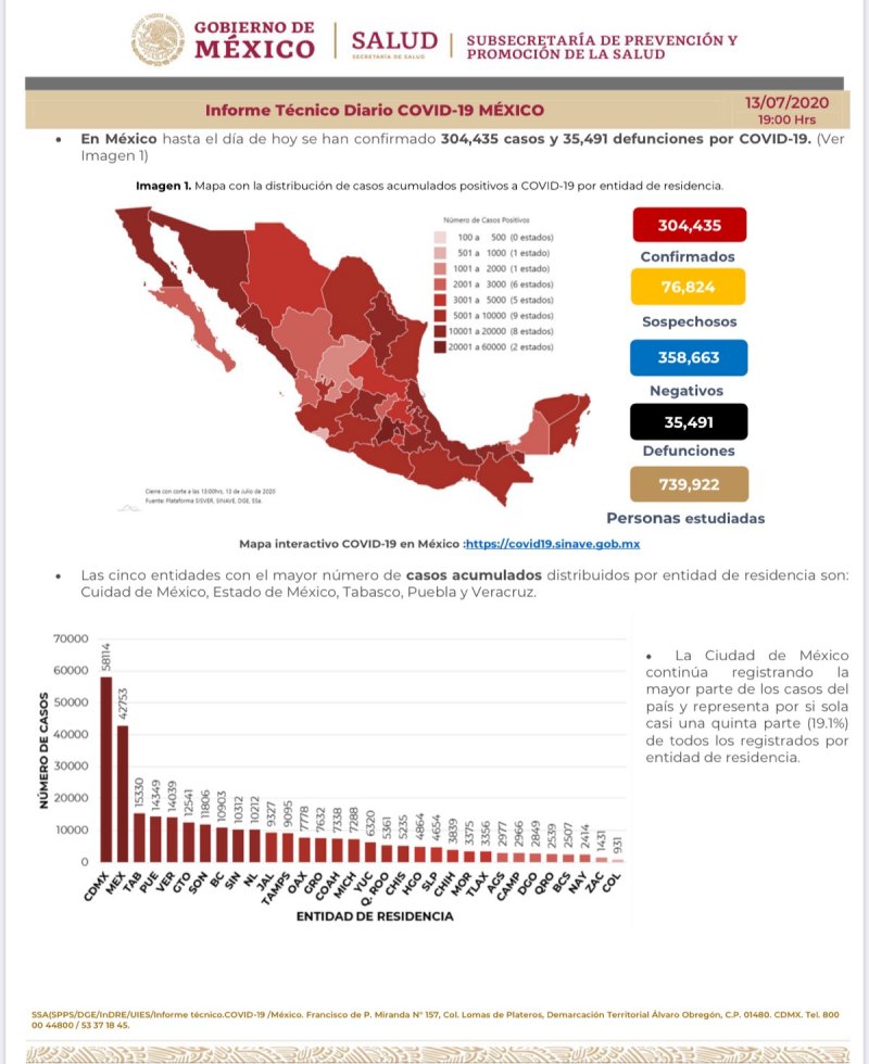 La Secretaría de Salud (Ssa) reportó 304 mil 435 casos de contagio de coronavirus y 35 mil 491 defunciones a causa de la enfermedad.