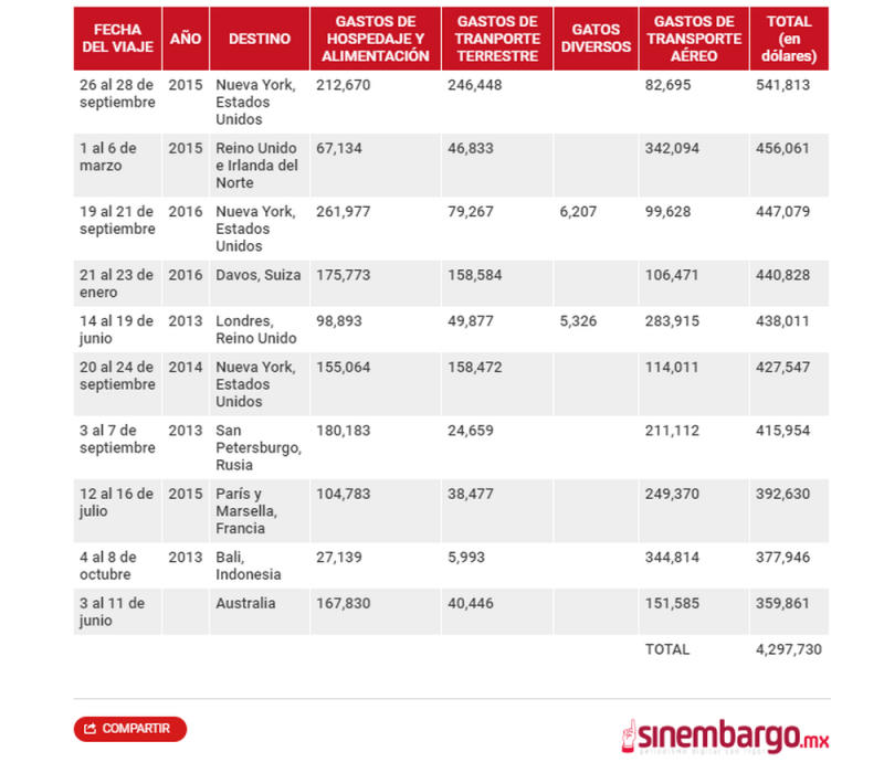 Sólo en esos 10 viajes realizados de 2013 a 2016, gastó 4 millones 297 mil 730 dólares (81 millones 656 mil 870 pesos).