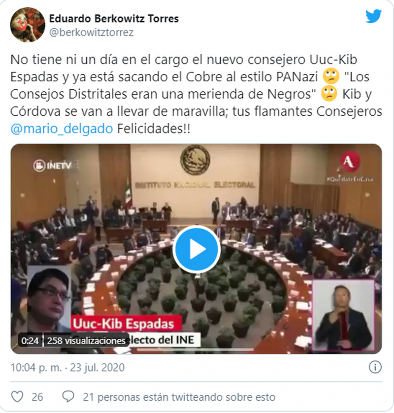 El nuevo consejero del INE, Uuc-kib Espadas Ancona, quien es un político mexicano, que militó en organizaciones de izquierda y ocupó el cargo de diputado federal de 2000 a 2003, desde el 27 de julio de 2020 será consejero del Instituto Nacional Electoral, pero este empezó con el pie izquierdo, pues en una entrevista con Carmen Aristegui realizó un comentario racista; y lo peor es que ni cuenta se dio.