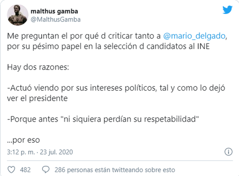 Y es que las redes no le perdonaron a Mario Delgado, quien tuvo a su cargo la conducción del proceso de aprobación de los nuevos consejeros del INE, pues aseguran que pactó con los partidos de oposición; motivo por el cual fue acusado de ‘traidor’.