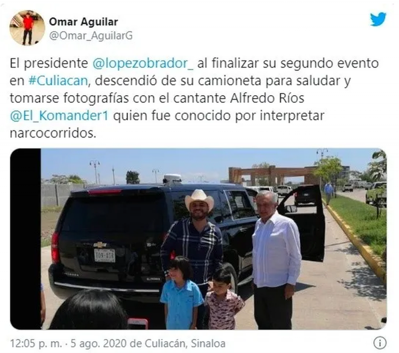 Esta mañana el cantante Alfredo Ríos, mejor conocido como "El Komander", no desaprovechó la oportunidad para fotografiarse junto al presidente Andrés Manuel López Obrador durante su gira por Culiacán, Sinaloa.