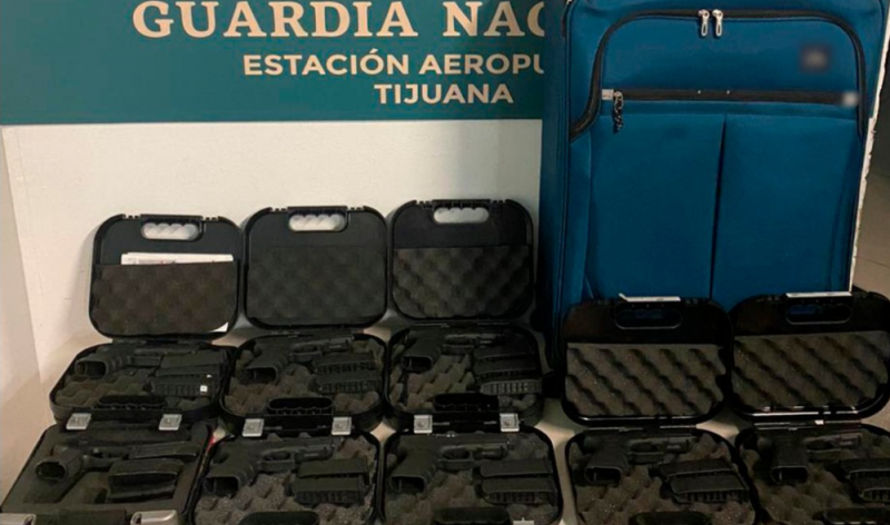 Elementos de la Guardia Nacional desplegados en el Aeropuerto Internacional de Tijuana, Baja California, detuvieron a una mujer procedente de Guadalajara, Jalisco, que viajaba con ocho armas de fuego cortas.