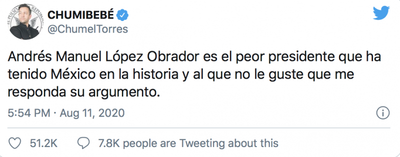 “Andrés Manuel López Obrador es el peor presidente que ha tenido México en la historia y al que no le guste que me responda su argumento”.