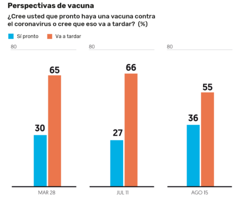 La expectativa de los mexicanos de que pronto podría haber una vacuna contra el coronavirus creció de 27 a 36 por ciento en entre el 11 de julio y el 15 de agosto, según revela la más reciente encuesta nacional de EL FINANCIERO. No obstante este avance en las expectativas, una mayoría de 55 por ciento opina que la vacuna todavía va tardar en estar lista. Esta opinión registró una baja de 11 puntos respecto al mes pasado, probablemente reflejando las noticias de avances en la vacuna en los últimos días.