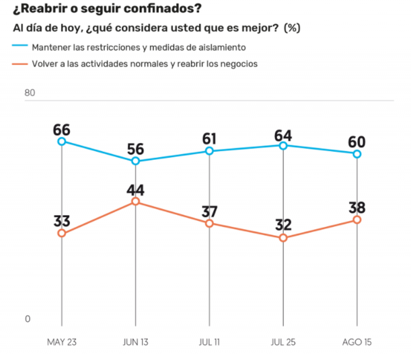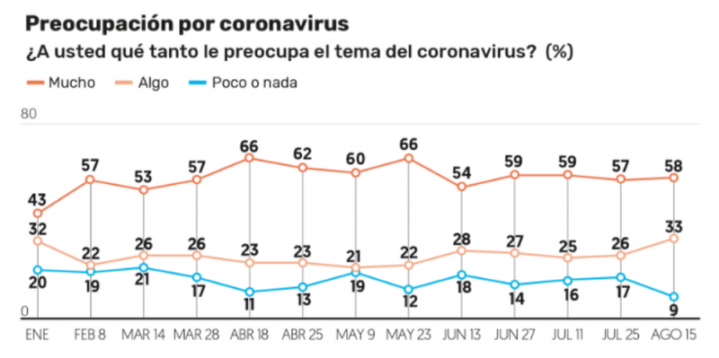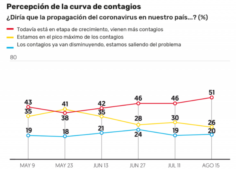 A pesar de que varias actividades han vuelto a una normalidad, la encuesta indica que el porcentaje de mexicanos que opina que la epidemia de coronavirus aún está en etapa de crecimiento subió de 46 a 51 por ciento, el punto más alto de esta opinión desde inicios de mayo, cuando comenzó a preguntarse. El 23 de mayo, la actitud más común era que ya se estaba en el pico de la pandemia, con 41 por ciento de menciones. Esa opinión ha bajado gradualmente hasta 26%, en agosto. Por su parte, quienes creen que ya salimos de la pandemia se ha mantenido más o menos constante, alcanzando 20% en este último estudio.