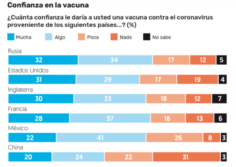La confianza en una vacuna china es la más baja, con 44 por ciento entre las categorías “mucha” o “algo” de confianza, y solamente 20 por ciento en la respuesta “mucha” confianza.