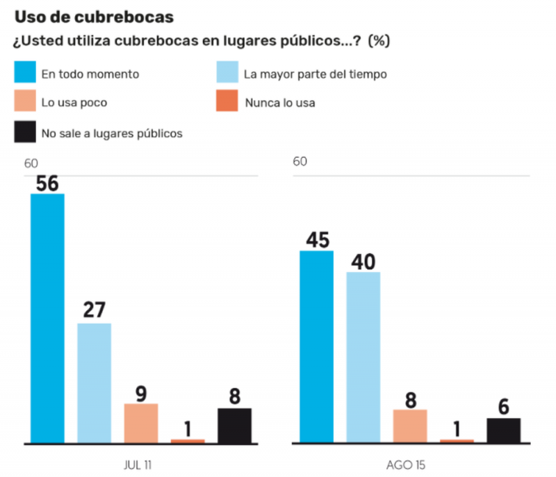 Según el estudio, en el último mes se registra una baja en el uso del cubrebocas, al pasar de 56 a 45 por ciento quienes dicen utilizarlo todo el tiempo en lugares públicos. Esta baja se compensa con una subida de 27 a 40 por ciento quienes dicen usar cubrebocas la mayor parte del tiempo.