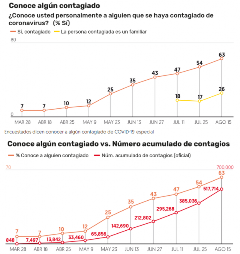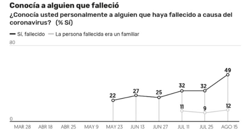 Lo que también alcanza un punto máximo en el sondeo de agosto es el porcentaje de mexicanos que conoce personalmente a alguien contagiado, que llega a 63 por ciento, de los cuales 26 por ciento afirma que se trata de algún miembro de su familia. El porcentaje que dice haber conocido personalmente a alguien que falleció a causa de coronavirus subió a 49 por ciento, incluidos 12 por ciento que reporta el fallecimiento de un familiar.