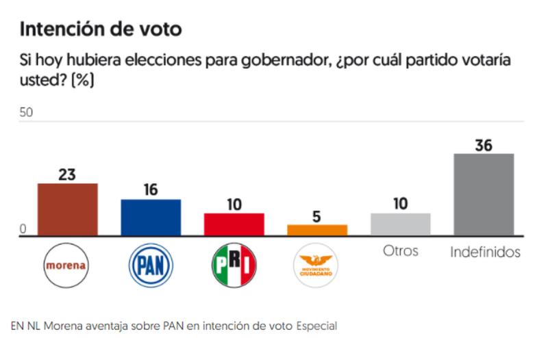 La intención de voto por partido en Nuevo León sitúa a Morena en primer lugar, con 23 por ciento, seguido de cerca por el PAN, con 16 por ciento; el PRI, con 10 por ciento, y Movimiento Ciudadano, con 5 por ciento.
